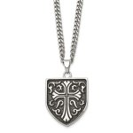 Stainless Steel 24" Antiqued Polished & Textured Cross Shield Curb Necklace